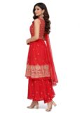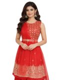 Make a graceful style statement with this stunning Red Kurti with Dhoti Salwar Set, designed for festive elegance and modern charm. Crafted with intricate golden embroidery and delicate detailing, this outfit beautifully blends traditional craftsmanship with contemporary silhouette.